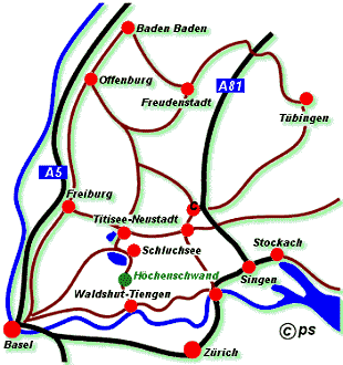 Autofahrer benutzen von der Autobahn Frankfurt - Basel kommend ab Freiburg-Mitte die B31 bis Titisee weiter auf der B500 Richtung Waldshut.