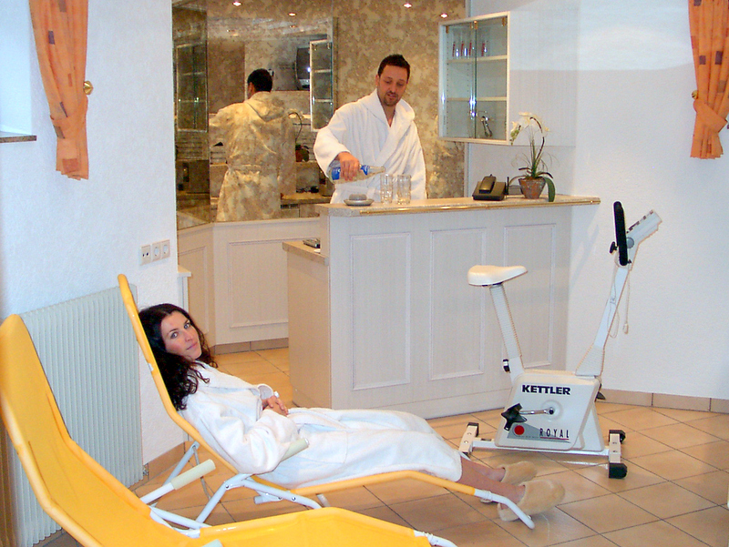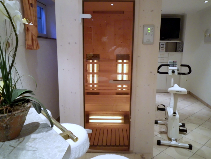 WellnessNehmen Sie sich Zeit und verwöhnen Sie sich in unserem gemütlichen Wellness - und Saunabereich (Haus am Steingarten). Wir bieten Ihnen Erholung für Körper und Geist, in unseren mit viel Liebe zum Detail eingerichteten Räumen. Neu unsere Infrarotkabine. Zum Wellness - und Saunabereich gehören eine Finnische- oder Bio-Sauna mit Farblichttherapie, Schwall- und Normaldusche, sowie ein Ergo-Fitnessrad zum täglichen Konditionstraining (Sauna und Infrarotkabine gegen Gebühr). |