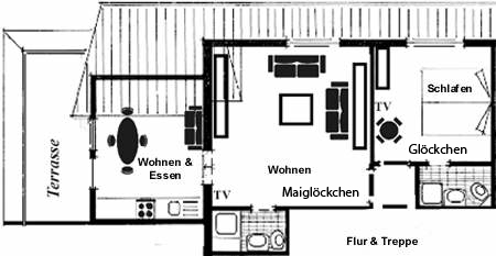 Ferienwohnung "Maiglöckchen"Die Ferienwohnung Maiglöckchen ist für 2 Personen geeignet Belegung bis 4 Personen ist mit dem Doppelzimmer "Glöckchen" möglich. Wohnung Maiglöckchen